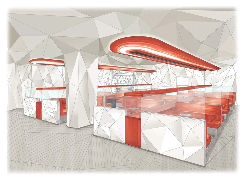 内装デザインはデザイナーの橋本夕紀夫氏に手掛けていただき、「洞窟」をモチーフとした店内に仕上げております。包まれるような空間と共に特急レーン焼肉をお楽しみいただけます。