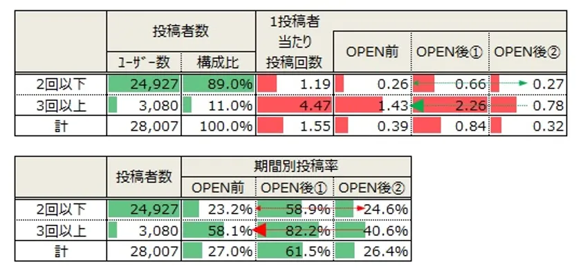 まず、対象期間中の投稿回数別に各話題の投稿率をみると、「1回」「2回」のグループと、「3回」「4回以上」のグループで、それぞれ投稿率のバランスが似ていることがわかりました。そこで、以降の分析は「2回以下」のグループと「3回以上」のグループにまとめて分析しました。すると、「2回以下」のグループでは、「OPEN前」と「OPEN後(2)」の1投稿者当たり投稿回数、投稿率ともにほぼかわりませんが、「3回以上」のグループでは「OPEN前」と比べて「OPEN後(2)」の方が1投稿者当たり投稿回数も多く、投稿率も高くなっていることがわかります。
