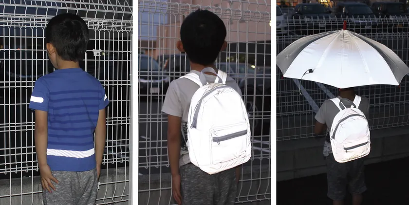 自動車のライトやカメラのフラッシュなどの光に反射して光るリフレクト(再帰性反射材)プリントを使用しています。安全作業着、軍事、道路標識に用いられるものと同様技術を使っています。