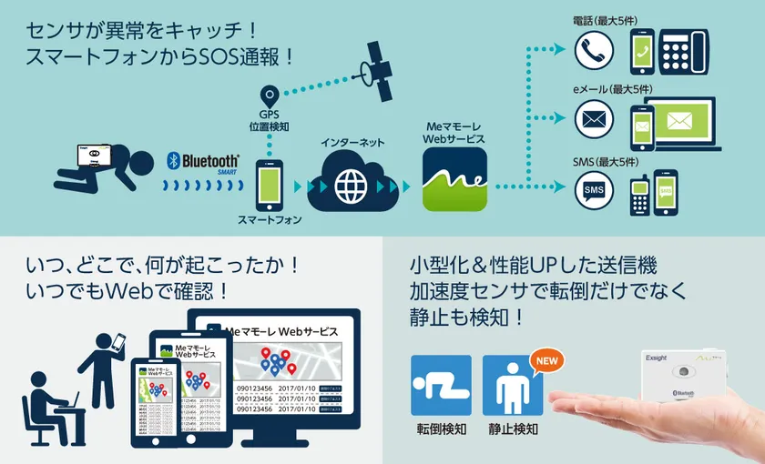 エクサイト株式会社(所在地:京都市山科区、代表取締役:諏訪部 晋正)は、自動で異常を検知し、スマートフォンと連動して緊急通報を行う、転倒検知送信機「EXH-BTTK2(Meマモーレ)」を開発し、2017年6月初旬より販売を開始いたしました。