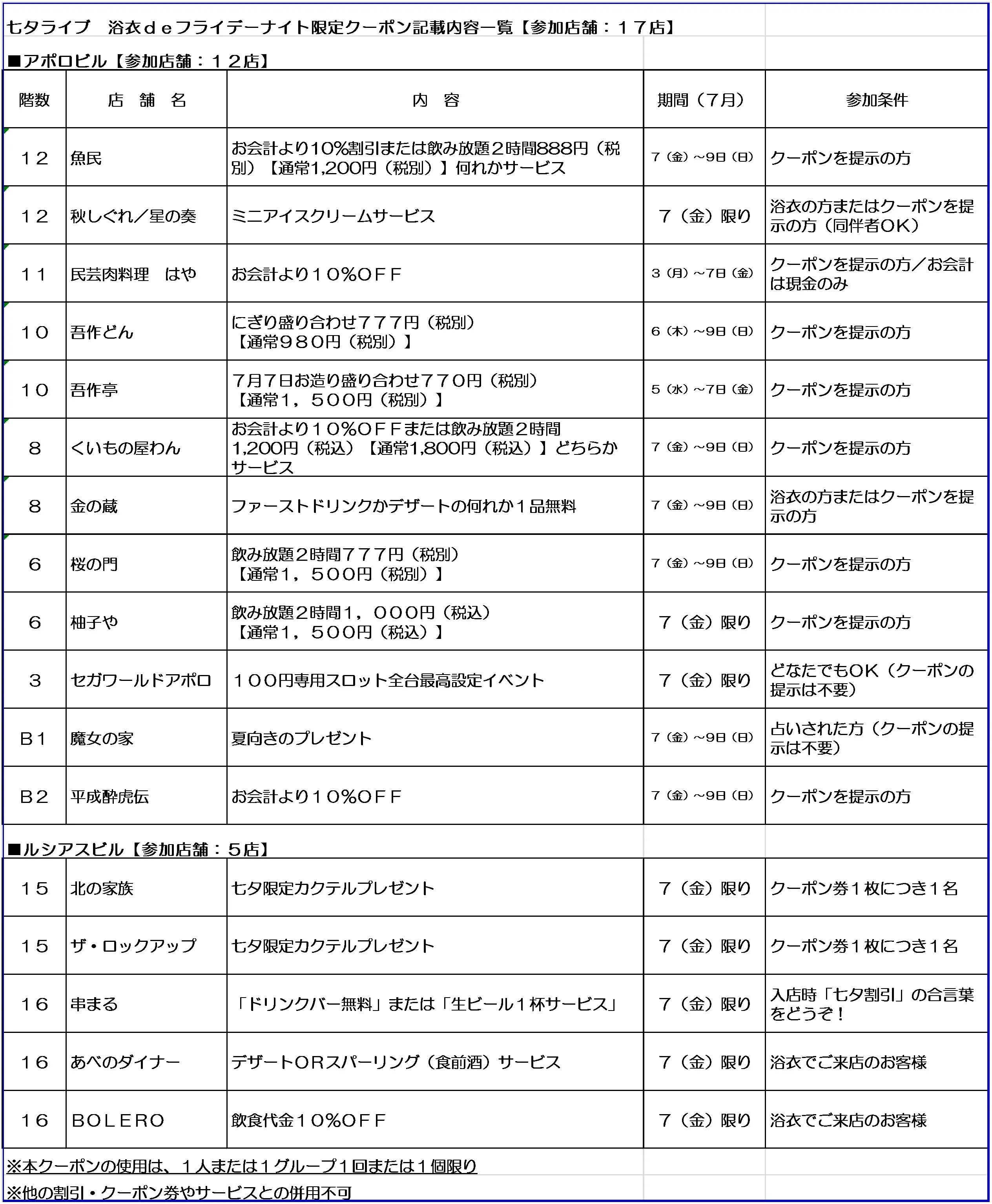 4.アポロビル・ルシアスビルの飲食店(一部除外あり)で七夕特製メニューや