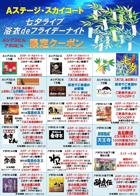 浴衣姿を「アポロ・ルシアスPhotoコンテスト」に Instagramで応募しよう! 「きんえいアポロビル開業45周年記念! 七夕ライブ 浴衣deフライデーナイト」 2017年7月7日(金)18時開始 (あべのAステージ・スカイコート)