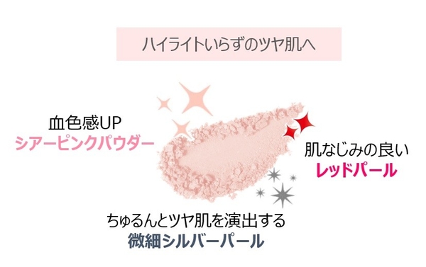 血色を良く見せるシアーピンクパウダーで、レッド&シルバーの微細パールを配合し、ハイライトいらずのツヤ肌に仕上げます。