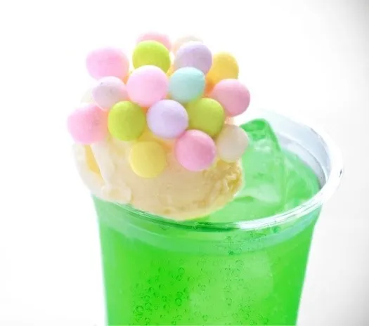 「庚申堂ソーダ」は、女性の浴衣姿が映える撮影スポットとして話題沸騰中の八坂庚申堂が公認するクリームソーダです。八坂庚申堂の境内に飾られている丸いカラフルなお守りは「くくり猿」といい、訪れた方が願い事をペンで書き込んで吊るすと、その願いが成就するといわれています。