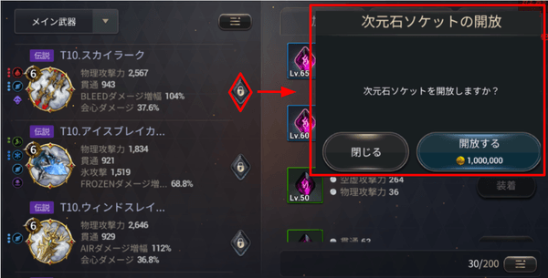 装備にある次元石ソケットを開放することで、加工済み次元石を装着できます。