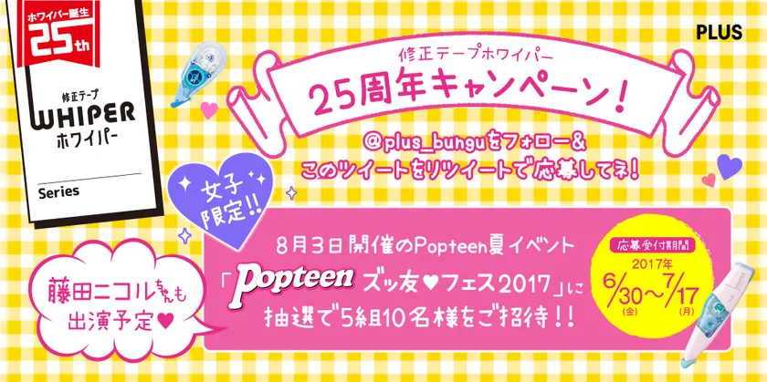 修正テープ「ホワイパー」25周年Twitterキャンペーン 藤田ニコルさんも出演のPopteenイベントにご招待!