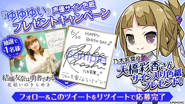 6月にお誕生日を迎えるふたりを祝うために、期間限定イベントに合わせてTwitterリツイート『声優サイン色紙プレゼントキャンペーン』を実施しております。キャンペーン期間中に『ゆゆゆい』公式Twitterをフォローして、該当のツイートをリツイートしていただいた方の中から抽選で長妻 樹里 さん(三好 夏凜役)と大橋 彩香さん(乃木 若葉役)のサイン色紙を各1名にプレゼントいたします!
