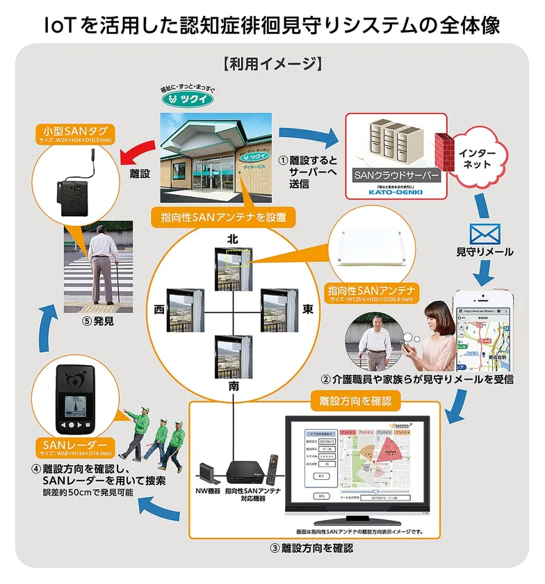 2017年6月27日 15:00株式会社ツクイ(本社:横浜市港南区、代表取締役社長:津久井 宏、以下 ツクイ)、加藤電機株式会社(本社:愛知県半田市、本部:東京都千代田区、代表取締役社長:加藤 学、以下 加藤電機)は、認知症行方不明者らの早期発見を目的として介護施設からの離設をいち早く検知し、離設方向が分かる新たな「指向性SANアンテナ」の開発を進めています。この度、検証に成功したことから、製品化に向けて、今夏より宮城県、新潟県内の事業所で初期導入検証を実施した後に、今秋から一般販売を開始する予定です。