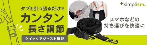 発売日に完売の人気スマホショルダーストラップが、素材を新たにリニューアルしてSimplismより再登場! 長さ調整1秒で、撮影も移動も快適に