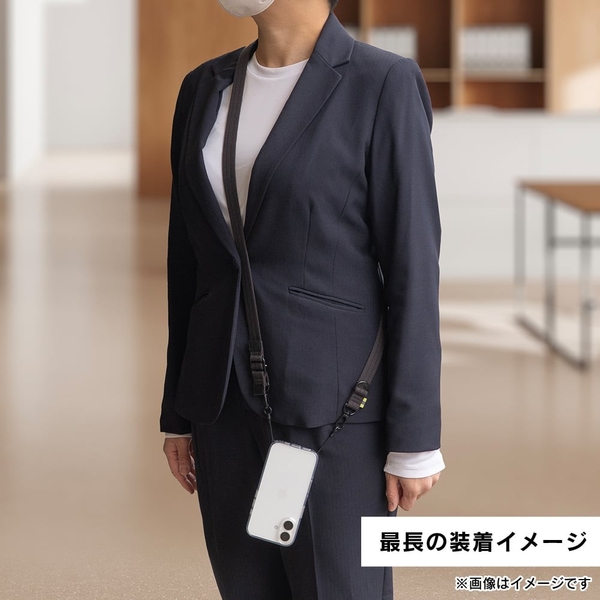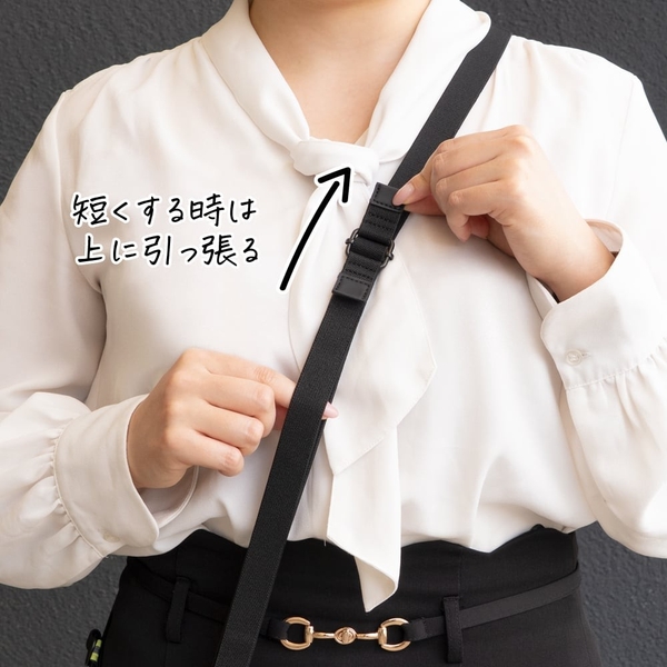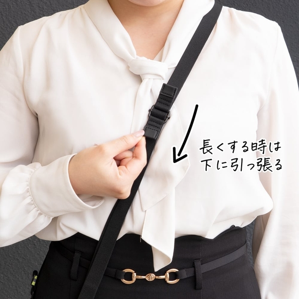 約74cm〜約135cmまで長さが調整できる(ストラップ本体のみ)ため、かさばるアウターの上からの着脱も可能です。