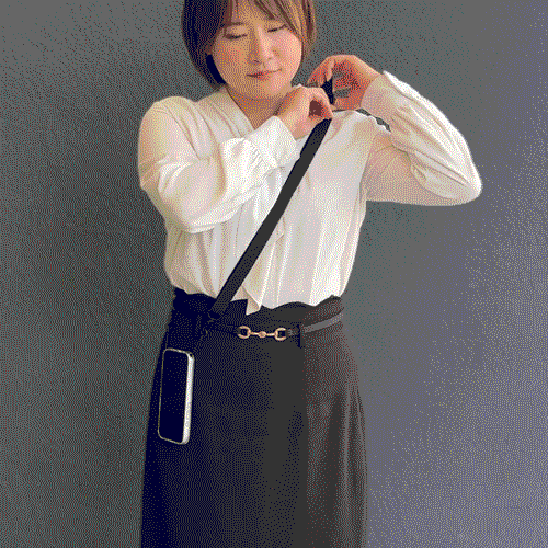 歩くときや、スマートフォンを使わないときは体にフィットするような短さで、撮影したいときや操作時には余裕のある長さに、瞬時に調整ができるクイックアジャスター機能を独自に設計しました。