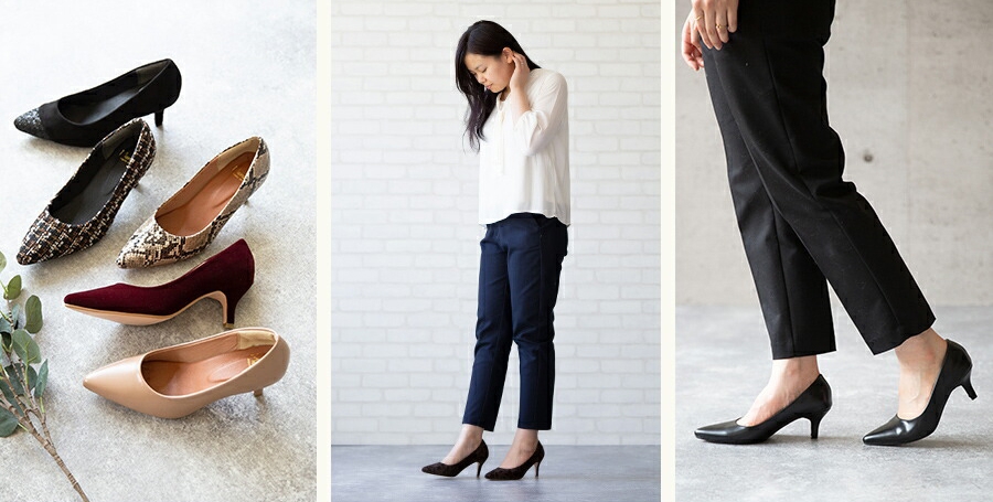 新色発売の7㎝ヒール、3cmヒール以外にも、フラット~7㎝ヒールまで、5種類の展開。お望みの1足に出会えるはず。