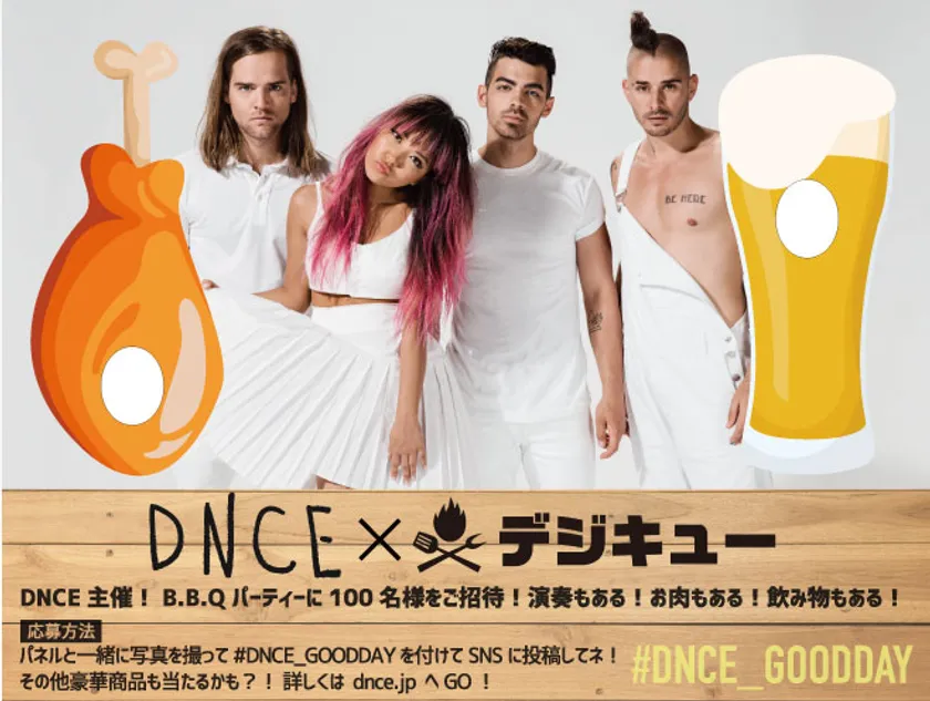 2017年3月には日本最大のポップ・ミュージック・フェス「POPSPRING 2017」に出演、更に初の単独来日公演も実施するなど日本のファンを大いに盛り上げたDNCEが、7月にプロモーション来日を果たすことが明らかとなりました。バーベキューシーンで食事をする様子が印象的な発泡酒のCMで話題の代表曲「Good Day」が収録されたアルバム「DNCE」が大好評となっている彼ら。来日に合わせ、更なる“お祭りイベント”として、デジキュー都内店舗にてDNCE主催のB.B.Qパーティーを開催します。開催に伴い、Twitter・Instagramにて対象アカウントをフォローの上、ハッシュタグ「#DNCE_GOODDAY」をつけて応募いただいた方の中から抽選で100名をご招待するキャンペーンを実施します。演奏あり・お肉あり・飲み物ありの1日限りのスペシャルB.B.Qパーティーに参加できるのは、抽選で選ばれた100名だけです。応募期間は6月27日から7月5日。6月28日から7月5日までの期間、デジキュー対象店舗に設置されたDNCEパネルと一緒に写真を撮って応募すると、当選確率が2倍となります。更に応募者の中から抽選でデジキュー利用ペア無料券(スパークリングワイン1本付き)が10名様に当たります。