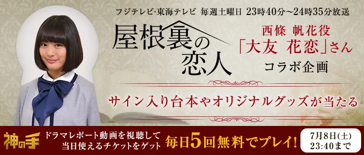 株式会社ブランジスタゲーム(本社:東京都渋谷区、代表取締役社長:木村泰宗)が運営する、神体験3Dクレーンゲーム「神の手」の第40弾企画が決定いたしました。今回は、現在放送中の東海テレビ・フジテレビ系ドラマ『屋根裏の恋人』(毎週土曜23:40~24:35、全8話)とのコラボ企画になり、景品はドラマに出演されている大友花恋さんの直筆サイン入り台本や番組オリジナルあぶら取り紙です。