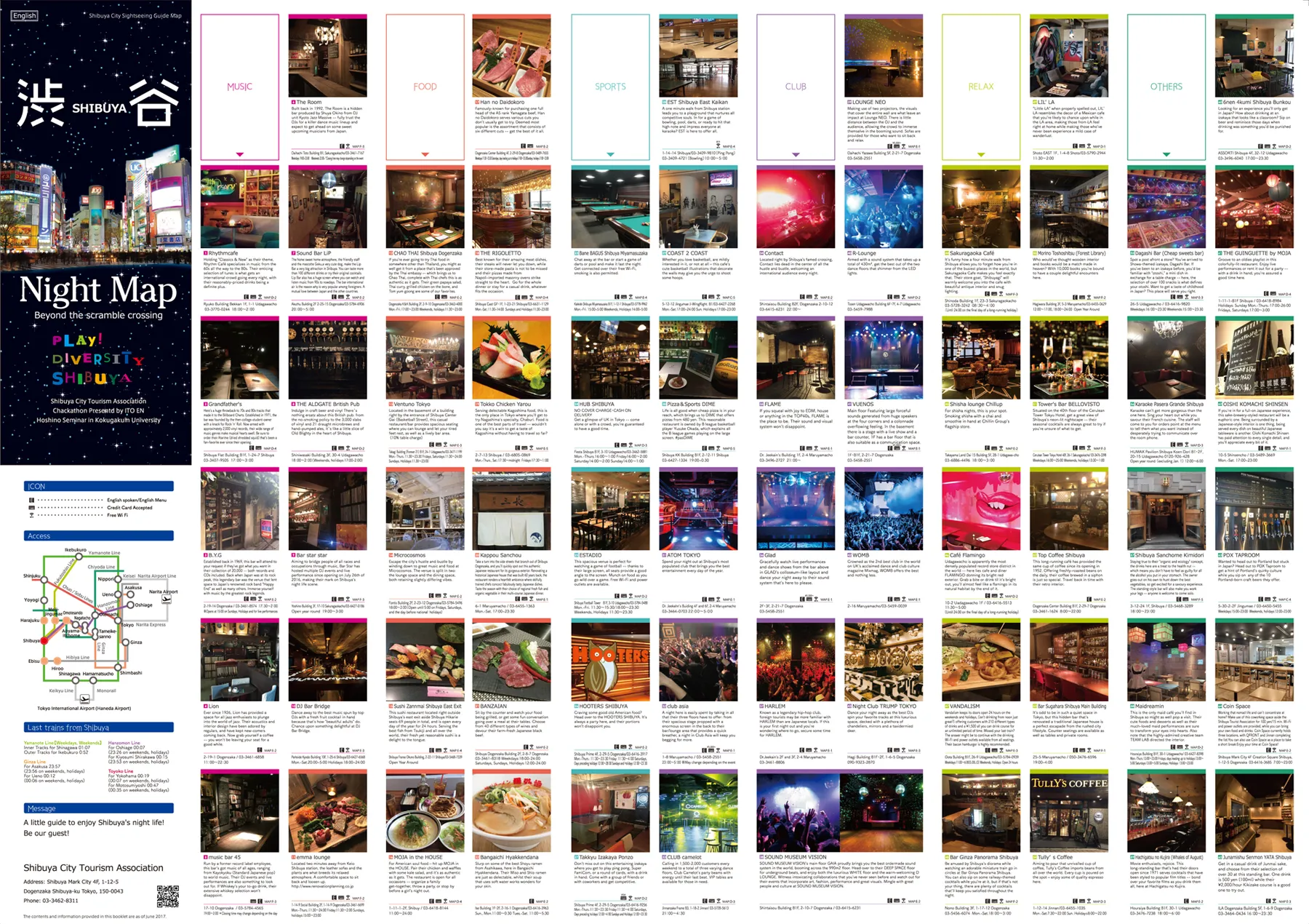 渋谷の文化形成に大きな影響を与えてきた夜の文化(音楽、ナイトクラブ、bar等)を一つの観光資産と捉えた、渋谷の“夜”に特化してご案内する観光マップです。訪日外国人観光客を含めた多くの観光客の方々に、渋谷の夜を楽しんでいただけるお店をピックアップしました。渋谷区のナイトアンバサダーを務める ヒップホップ・アクティビストのZeebra氏やFIG&VIPERディレクター・DJの植野有砂氏、TRANSIT GENERAL OFFICE 代表取締役社長 中村貞裕氏も監修に参加しています。