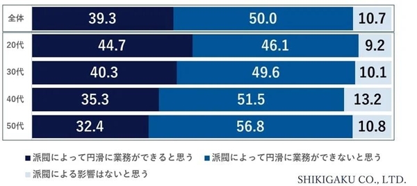 また年代別にみると、「派閥によって円滑に業務ができないと思う」については、年代が上がる毎に増加しており、“派閥”のつながりが醸成されていくことでやりづらさのようなものが出来上がってくることがうかがえます。