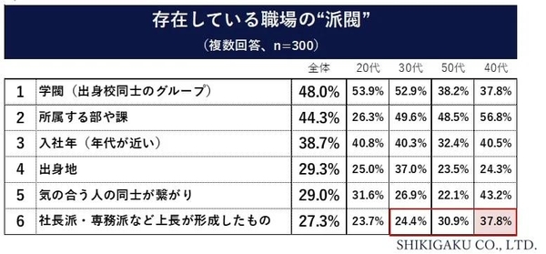 → 社長派・専務派などの上長が形成する“派閥”は年代が上がるにつれ上昇