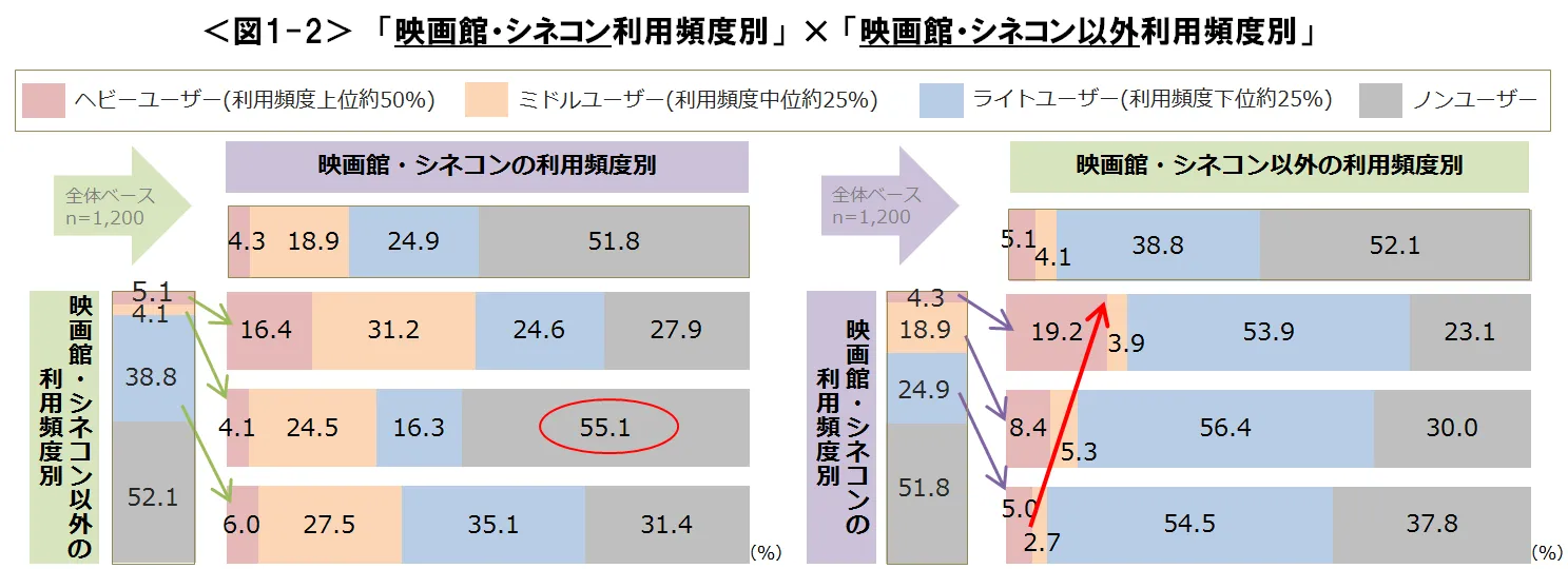 ●各映画鑑賞手段の利用頻度は、「映画館・シネマコンプレックス」利用が83%で最多。次いで「レンタルDVD・Blu-ray」が52%と続く。「動画配信サービス」、「有料放送」は利用割合は低いが、【週1回~毎日】の利用者が他のサービスより多く利用者の利用頻度は高い傾向。映画館・シネコン利用者と、映画館・シネコン以外の利用者を各頻度でユーザークラスを分けて比較してみると、【映画館・シネコン以外】ユーザー視点では、ミドルユーザーの55%が【映画館・シネコン】を利用しておらず、【映画館・シネコン】のみを利用している割合が高い。【映画館・シネコン】ユーザー視点では、ライトユーザーからヘビーユーザーになるほど【映画館・シネコン以外】の利用頻度も高くなり、多様なサービスを活用している映画ファンであると捉えられる。 <図1-1,図1-2>