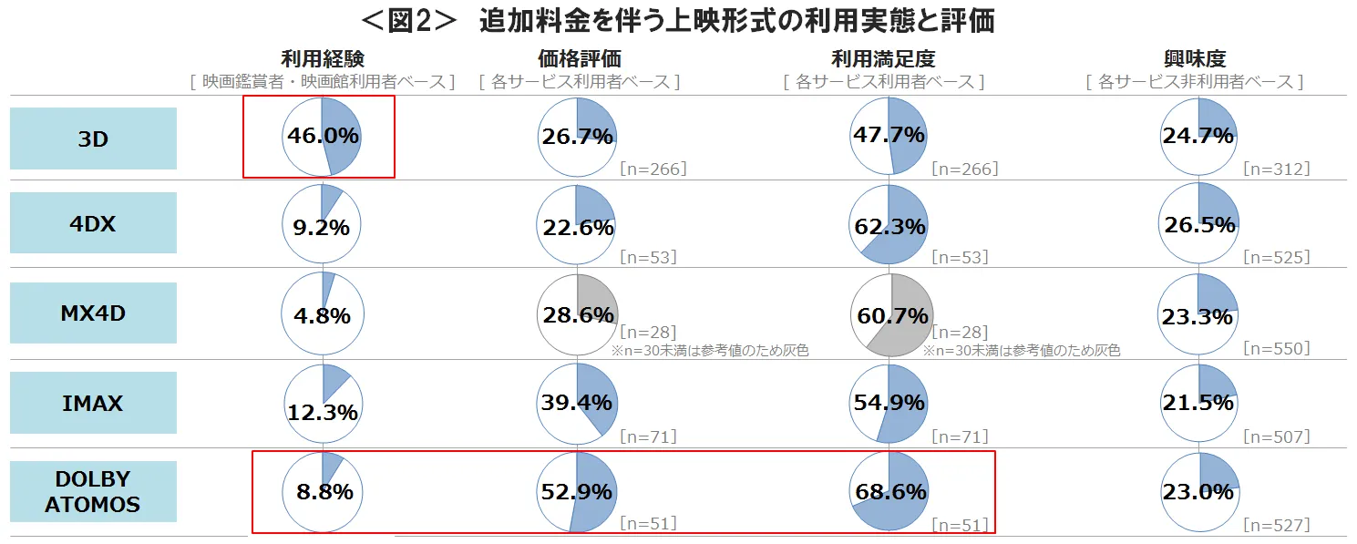 ●利用実態では「3D」の利用率が46%と半数近くを占めて最多に。「DOLBY ATOMOS」は利用率は9%と低いが、価格評価・利用満足度が他の上映方式と比べて最も高く、利用者の評価・満足度の高さがうかがえる。 <図2>