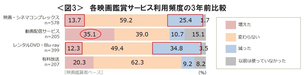 ●各映画鑑賞サービスの利用頻度の3年前比較では、全体で「動画配信サービス」の増えた割合が35%で最も多い。一方、「映画館・シネマコンプレックス」、「レンタルDVD・Blu-ray」は増えた回答より減った回答が多く、利用頻度の減少がみられる。 <図3>