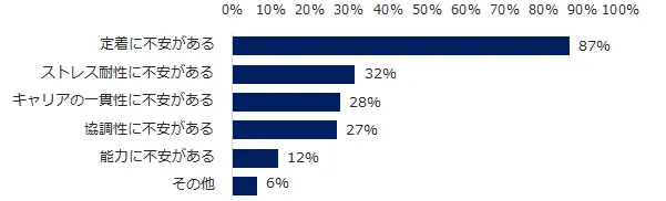 「ミドルを採用する企業が転職回数を気にする理由」の第1位は「定着に不安がある」(87%)、第2位は「ストレス耐性に不安がある」(32%)、第3位は「キャリアの一貫性に不安がある」(28%)でした。「転職癖がついているのではないか、周囲との人間関係が築けるのかを気にされています」などのコメントが見受けられました。