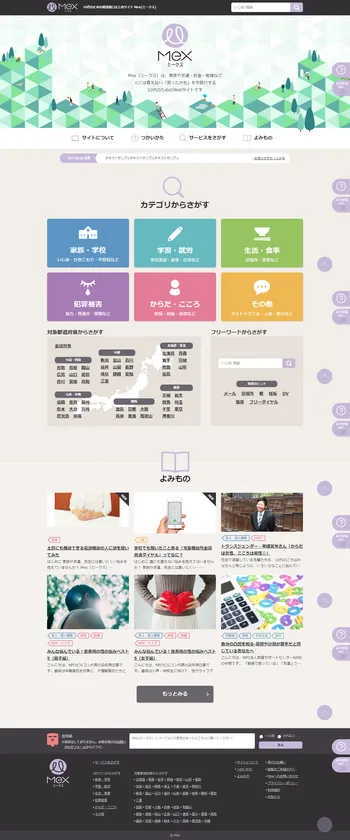 「Mex(ミークス)」は、家族や学校・からだやこころ・お金・勉強など、人には言えない悩みを持っている子どもたちが自分に合った支援サービスを利用できるよう情報をひとつにまとめたサイトで、各サービス情報のページから電話・メールでの相談や予約ができ、インターネットに駆け込んだ子どもたちが安心して相談できる支援団体にいち早くたどりつけることを目指してきました。