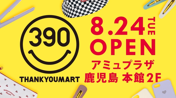 エルソニック株式会社(本社:大阪府吹田市)の展開する店内全品390円(税込429円)の雑貨店「サンキューマート」は、8月24日(火)に全国96店舗目となる新店を『アミュプラザ鹿児島』にオープンいたします。鹿児島県内では実に6年ぶりとなる新規出店となります。