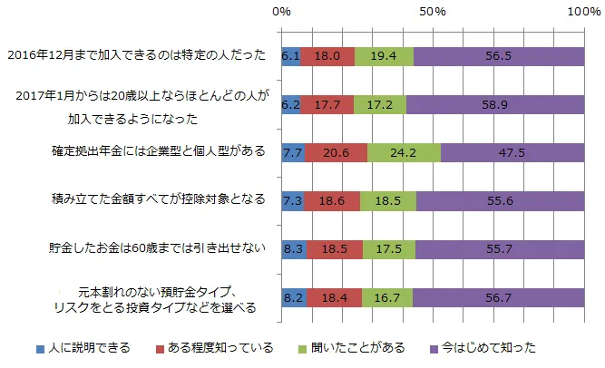 確定拠出年金制度に対する理解度は、企業型と個人型があることのみ「聞いたことがある」以上が52.5%と若干高いものの、「人に説明できる」「ある程度知っている」は、全項目において3割以下となっており、確定拠出年金に対する理解度は全体的に低いようです。