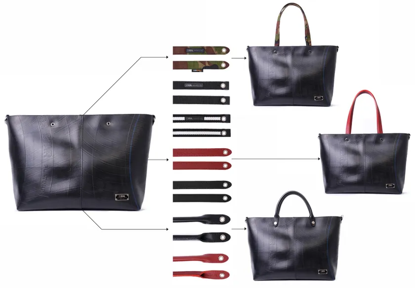 「トートバッグWEAR」は、実際に使用し廃棄されたタイヤチューブを使い、日本の鞄職人の高い技術によりそのままの状態にて全面にリユースしています。本新製品は、毎日服を決めるように、その日の服装や気分に合わせてハンドルを簡単に付け替える事が出来る、というコンセプトのもと開発いたしました。ハンドル部分は別々での販売となり、休日にも相性抜群の迷彩柄やスーツにも合う本革丸手ハンドルなど、初回は全7パターンからお好きな物を選んで購入が可能です。独自に開発した金属パーツにより鞄本体とハンドルは違和感なくかつ簡単に連結する事が出来ます。本年夏以降より、ハンドルや鞄本体のバリエーションは順次拡充する事を計画しています。