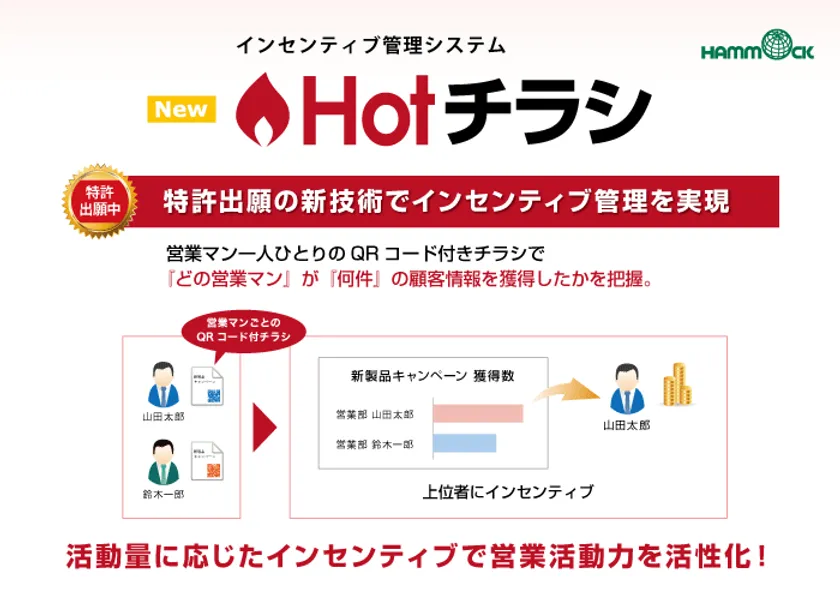 そこでハンモックでは、営業マン一人ひとりのQRコードを発行し、チラシを配布することで、どの営業マンが配布したチラシから、何件の顧客情報を獲得できたかを計測できる新サービス、インセンティブ管理システム「Hotチラシ」を開発し、ご提供を開始いたします。