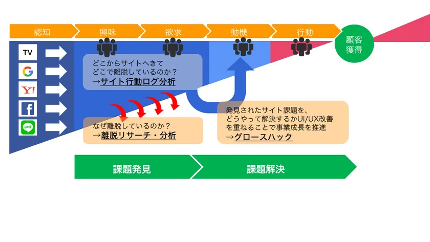 目標とするKPIを改善していくための課題発見を目的として、サイト内にいるユーザーの行動ログ解析から“どこからきて、どこで離脱しているのか?”を分析し、課題の箇所を特定します。