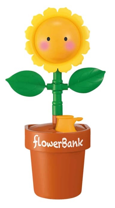 植木鉢ににっこり微笑んだ一輪のひまわりの花。貯金をすることでひまわりの花とのおしゃべりや、その仕草を楽しむことができます。花とコミュニケーションを楽しめる全く新しい貯金箱が『Flower Bank』です。