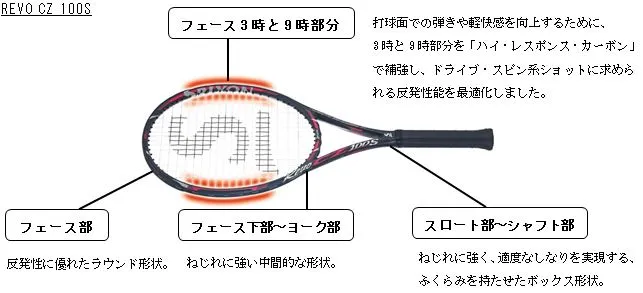 「REVO CZ」シリーズは、初代モデルからソニックコア(高反発素材)をフェース部フレーム内に装着し、軽量設計にも関わらず、300g以上の競技モデルとほぼ同等の反発性能を実現。スイングスピードが上がる操作性の良いラケットとして定評を得ていました。今回、この素材の一部を制振ゴム※1に変更したことで、インパクト時の衝撃を効果的に吸収・抑制。これにより面の安定性が向上しました。また、フレームに強靭なカーボン繊維「ハイ・レスポンス・カーボン」を部分採用することで、各機種に求められる反発性能の最適化を図り、より振り抜きやすく、より打ち勝てるラケットに進化しました。