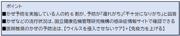 しかし、かぜ予防を実施している方でも、約6割の方が予防が「遅れがち」、又は「不十分になりがち」と回答しました。