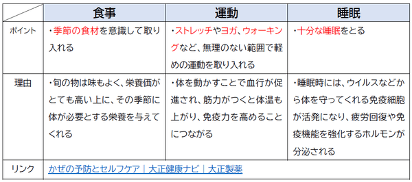 かぜ予防は、【ウイルスを侵入させないケア】×【免疫力を上げる】の組み合わせが重要です。ここでは大正健康ナビに掲載されている医師推奨の具体的な予防方法とポイントをご紹介します。