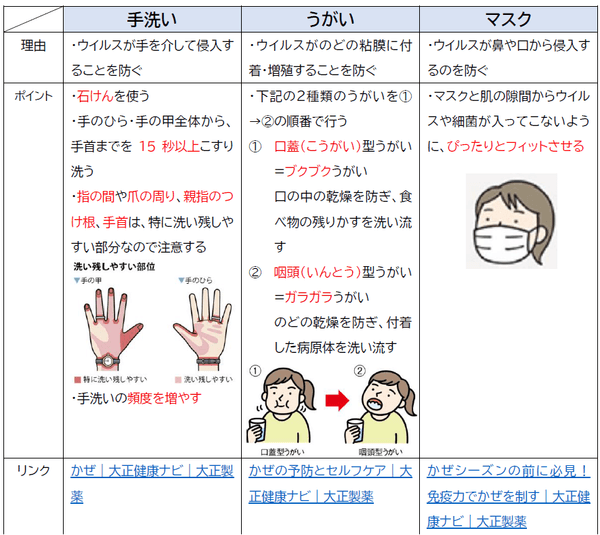 皆さんが普段から行っている手洗い・うがい・マスクですが,下記のポイントを意識して行うことで、より効果的な予防につながります。