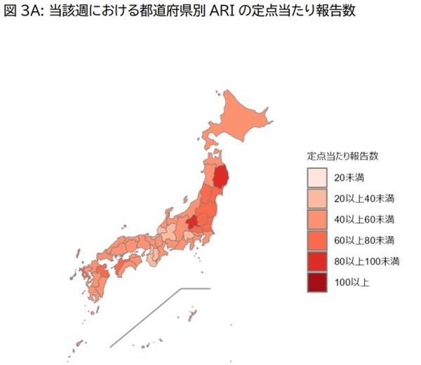 国立健康危機管理研究機構では、全国の医療機関から集めたデータをもとに、2025年4月からかぜを含む急性呼吸器感染症(ARI)の流行状況などを毎週発信しています。例えば、下記のような都道府県別の急性呼吸器感染症(ARI)の報告数から、あなたのお住まいの地域の流行状況を知ることができます。