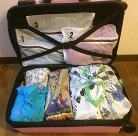 風呂敷やバンダナで荷物をまとめ、洗濯ネットも併用で収納し、新旧をうまく使っていた点が良かったです。