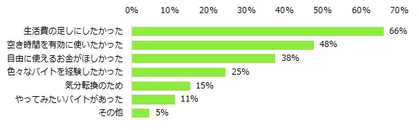 アルバイトのかけもち経験がある方に、その理由を伺ったところ、「生活費の足しにしたかった」(66%)が過半数を占めました。そのほかに「空き時間を有効に使いたかった」(48%)、「自由に使えるお金がほしかった」(38%)が続きます。