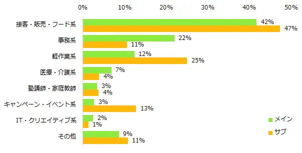 アルバイトのかけもち経験がある方に、アルバイトを伺ったところ、もっとも多かったのは「接客・販売・フード系」(メイン:42%、サブ:47%)でした。サブでは、軽作業系を選ぶ人が多いようです。そのほかに、かけもちしていた期間は「3ヶ月以上」(58%)、かけもちをして得た収入は「10万円以上」(35%)という回答が多く挙げられました。