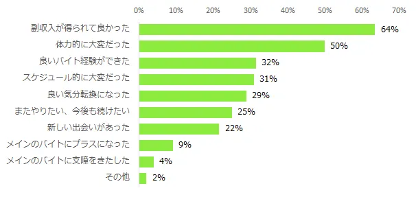 アルバイトのかけもち経験がある方に、感想を伺ったところ、「副収入が得られて良かった」(64%)と回答する方が過半数を占めました。