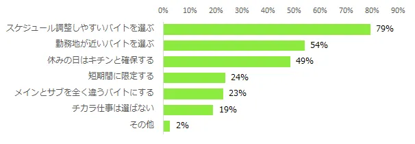 アルバイトのかけもちを成功させる秘訣を伺ったところ、第1位は「スケジュール調整しやすいバイトを選ぶ」(79%)、第2位は「勤務地が近いバイトを選ぶ」(54%)、第3位は「休みの日はキチンと確保する」(49%)でした。