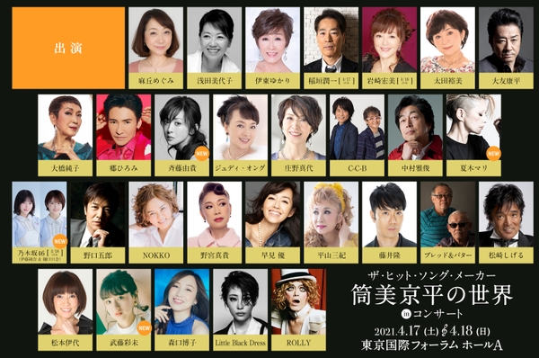 日本人なら誰もが知っている名曲の数々を、豪華出演陣と、日本を代表する実力派ミュージシャンの演奏により、全曲・筒美京平作品でお送りする本コンサートの、最終出演者と予定演奏曲目の追加を発表いたします。
