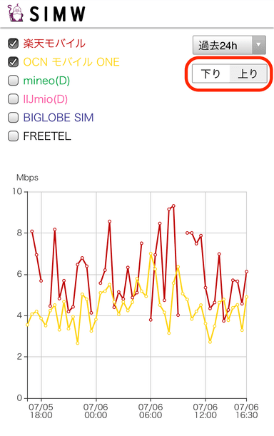 【SIMW(シムゥ)】とは、人気の格安SIM事業者の通信速度を自動計測し、リアルタイムに公開するWebツールです。契約する前には分からない格安SIMの「実際の通信速度」を容易に知ることが可能で、ブランドごとに比較もできます。ブランド選択以外にも、期間や[上り][下り]を選択できます。