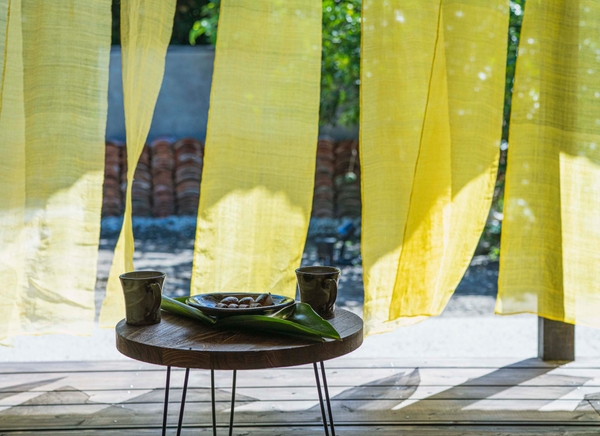 久志の縁側にしつらえた布は、福木を染料に染めたもの。