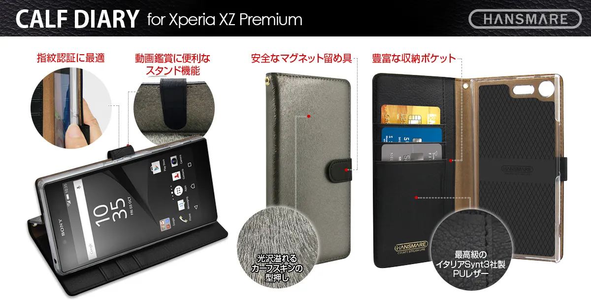 モバイルケース・アクセサリー専門の株式会社ロア・インターナショナル(所在地:東京都新宿区、代表取締役社長:Ally Won)は、HANSMARE(ハンスマレ)から代表作ともいえる、光沢感のあるPUレザーに繊細なカーフヘアー(仔牛の毛並)の型押しを施し、心地良い肌触りを再現した「CALF DIARY」のXperia XZ Premium専用ケースを発売しました。