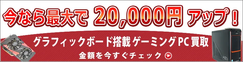 キャンペーン中は、通常の査定結果(内容物の有無、商品状態のチェック)に加え、グラフィックボードに対応した増額ボーナスを最大20,000円付与。ゲーミングPCとしての価値を最大限に査定いたします。