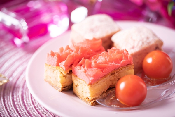 メインのスイーツスタンドは、ピンクカラーで統一し、大人かわいい女性を表現するため“ティアラやバッグ、リング”などのファッションアイテムをスイーツのモチーフに取り入れ、細部まで趣向を凝らしたスイーツに仕上げました。