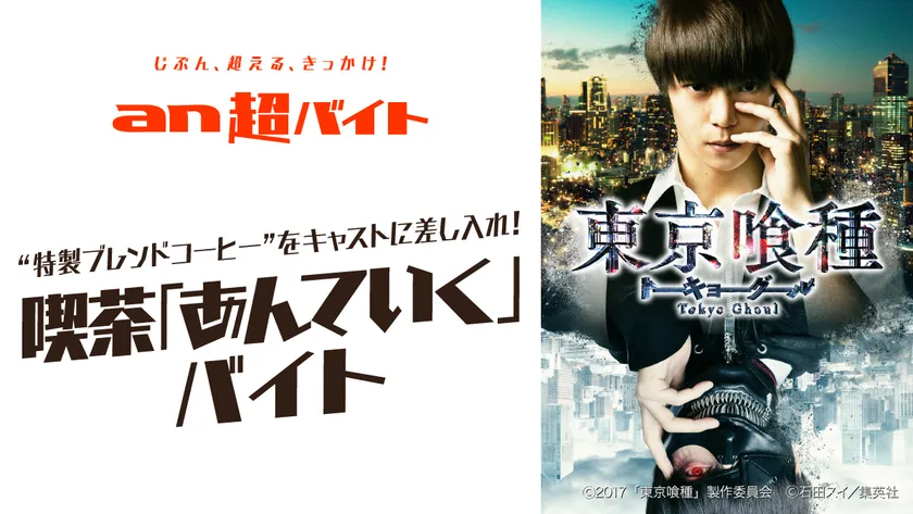世界累計3,000万部を超える超人気コミックを、窪田正孝さん主演で実写化した映画『東京喰種 トーキョーグール』(2017年7月29日公開)。今回の「an超バイト」では、主人公・カネキも働く、原作でもおなじみの喫茶店「あんていく」のバイトを2名大募集します。