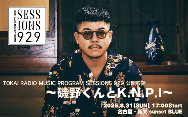 「TOKAI RADIO MUSIC PROGRAM SESSIONS 929 公開収録 ~磯野くんとK.N.P.I~」は、8月31日(日)17時開演。チケット発売開始は7月11日(金)18時からで、税込2,800円となる。